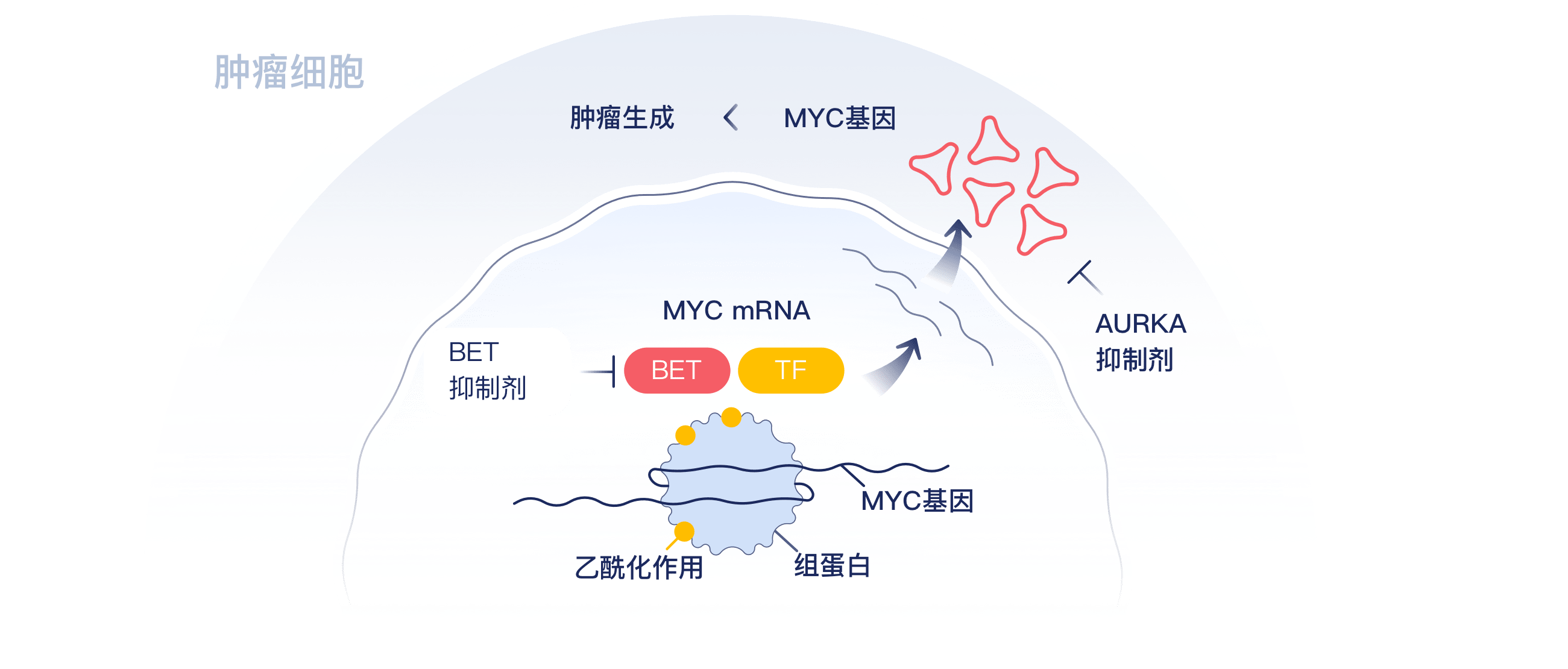 BET(bromodomain and extraterminal domain)家族包含4个功能相似蛋白:BRD2、BRD3、BRD4和BRDT。BET通过控制癌基因如c-Myc的表达在肿瘤发生中发挥关键作用。 BET蛋白可特异性识别赖氨酸乙酰化的组蛋白,从而调控基因转录,亦可通过对转录因子等非组蛋白的乙酰化修饰而广泛参与细胞周期、细胞分化、信号转导等过程。肿瘤细胞中BET的活性增加可导致促肿瘤蛋白MYC的高表达,进而促进肿瘤的生长。MYC作为转录因子,是一个经典的致癌基因,因其蛋白结构散乱而长期难以被直接靶向。